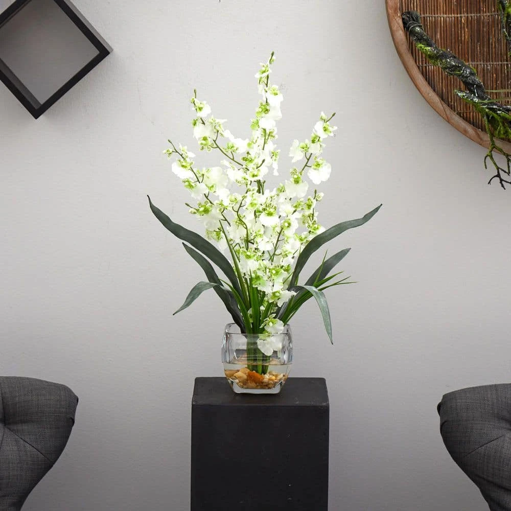 With its winding stems and curvy stalks, It’s easy to see why this member of the Orchid family is called the Dancing Lady. These beautiful and unique orchids rest snugly in a short oval-shaped glass container, which is filled with artificial water and an abundant supply of river rock to compliment its appeal. This extraordinary arrangement is the perfect way to spice up any room or office space.
