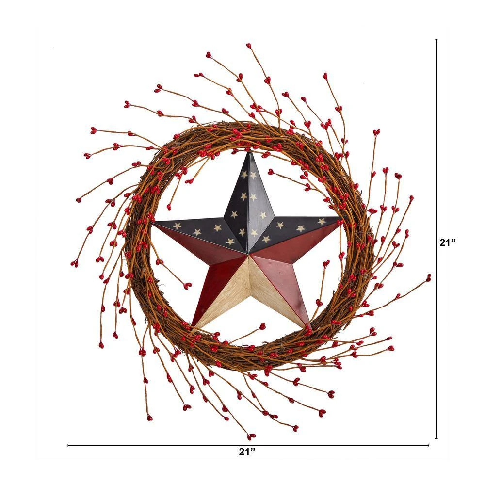 Are you feeling patriotic. Put love for your country on full display with this Patriotic Barn Star Berry Twig Wreath. A metal star in red, white, and blue colors is enclosed in the twig wreath accented by berries. Bendable twigs allow you to customize in your space while having some fun, be careful not to break. With a diameter of 20 in. showcase on any door that needs a little Americana touch. Light it up-year-round or during holidays like the 4th of July, Memorial-day, or Veterans-day. Makes a great gift. Artificial wreaths are manufactured using synthetic materials, such as polyester material or plastic, and are well designed and constructed to be life-like in appearance. This item will need to be re-shaped when removed from the secure box to allow it to reach its fullest size. Your wreath will look beautiful for-years to come, simply wipe clean with a soft dry cloth when needed.
