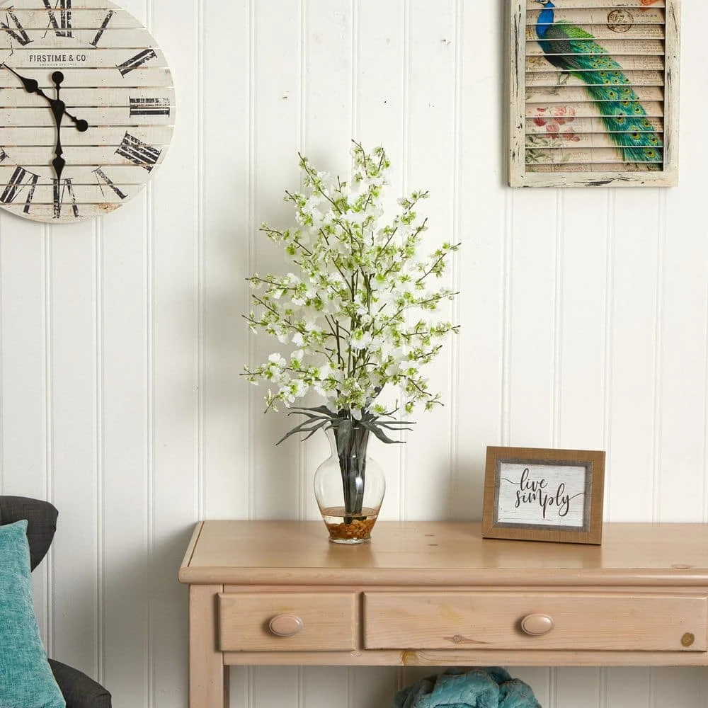 Brighten up your favorite living areas with this silk Dancing Lady orchid arrangement. This silk arrangement features dozens of full blooms and gorgeous green leaves. It stands 31 in tall and sits in a classic clear glass vase with river rocks and artificial water. If you’re looking to brighten up that certain area in your home or office this piece is a must have.