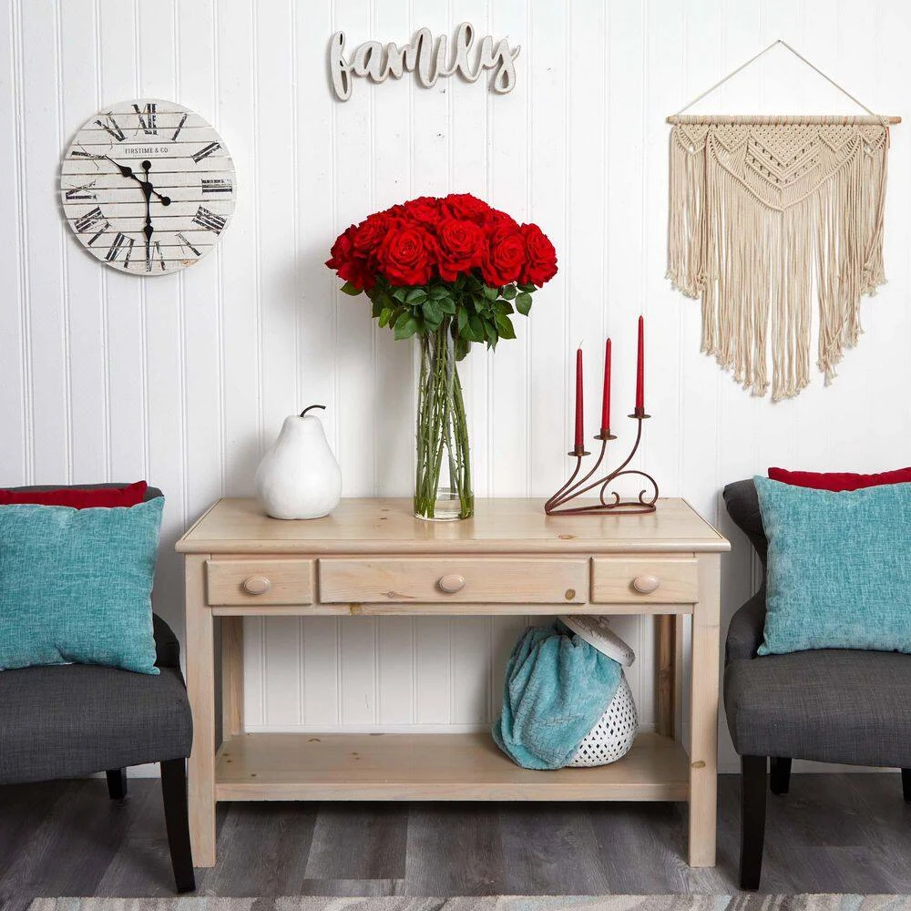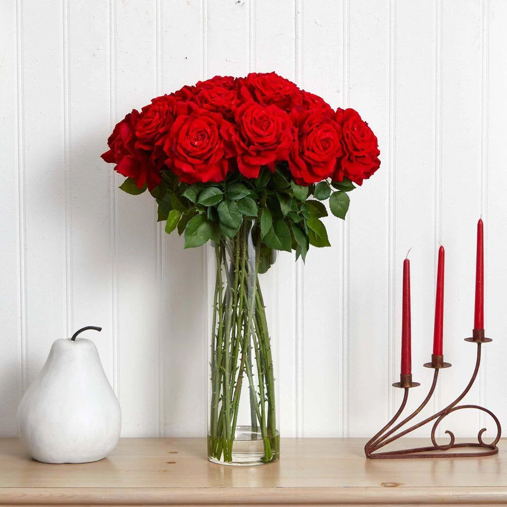 Enjoy the timeless beauty of the eternal symbol of romance: The rose. Our Giant Rose arrangement is brimming with a large number of rich deep colored roses that sit majestically on a bed of vivid green leaves, and stands 31 in. high. The glass vase comes with liquid illusion faux water, and encases the thorny green stems oh-so-perfectly. This is by far our most elegant selection of all our rose arrangements.