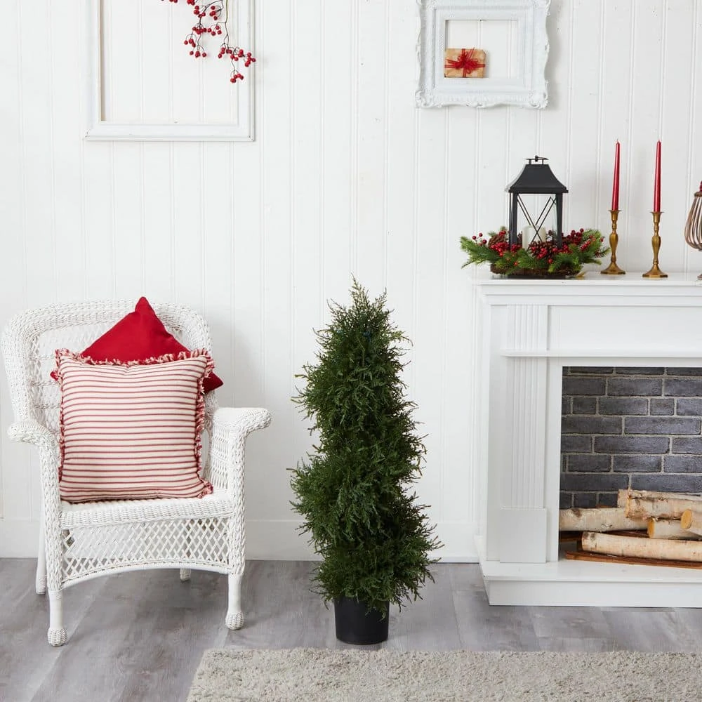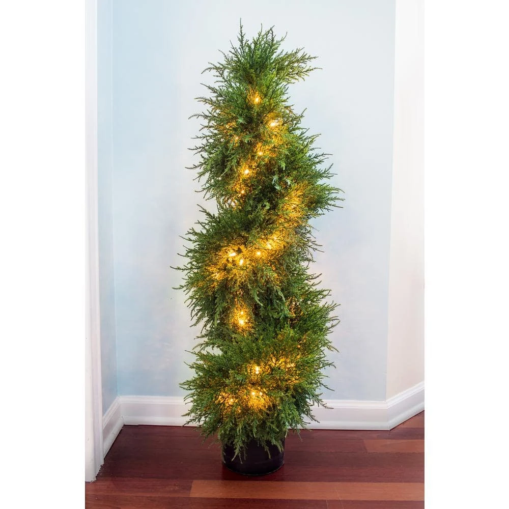 Instant holiday feelings that will last for years. This beautiful Cedar Spiral Topiary stands a tall 43 in. high and twists to the heavens in a lush, green cascade. But that’s only the beginning – plug it in and it lights up, ensuring smiles all around. Complete with a faux trunk and black pot, this Cedar Spiral Topiary will be part of your holiday decor for years to come.