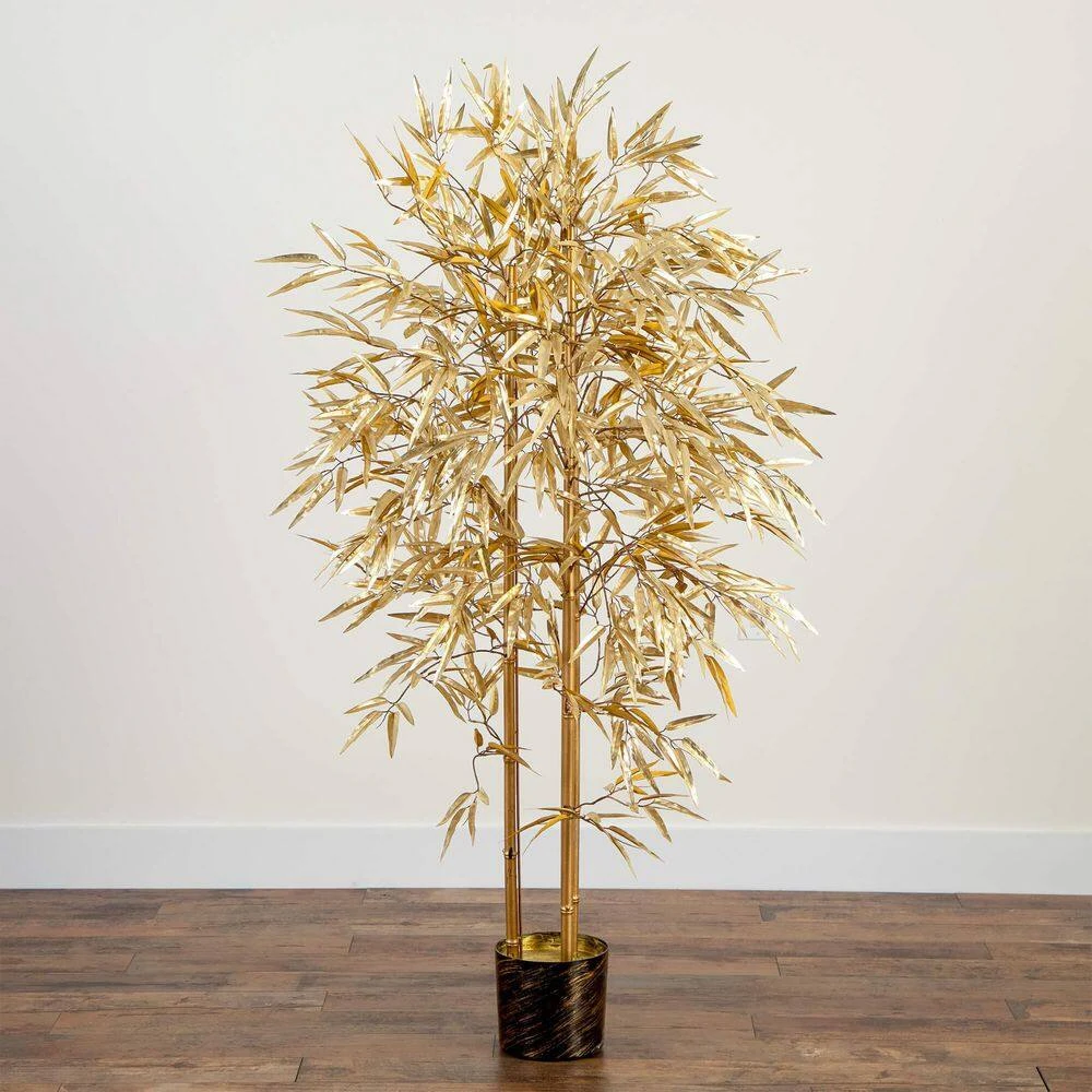 Reaching a striking 5 ft. high, this beautiful Golden Bamboo Tree is a lush arrangement that showcases 880 vivid leaves cascading out from its decorative pot in a fountain of foliage. Each and every part of this tree is complete with a gold finish to add that extra bit of