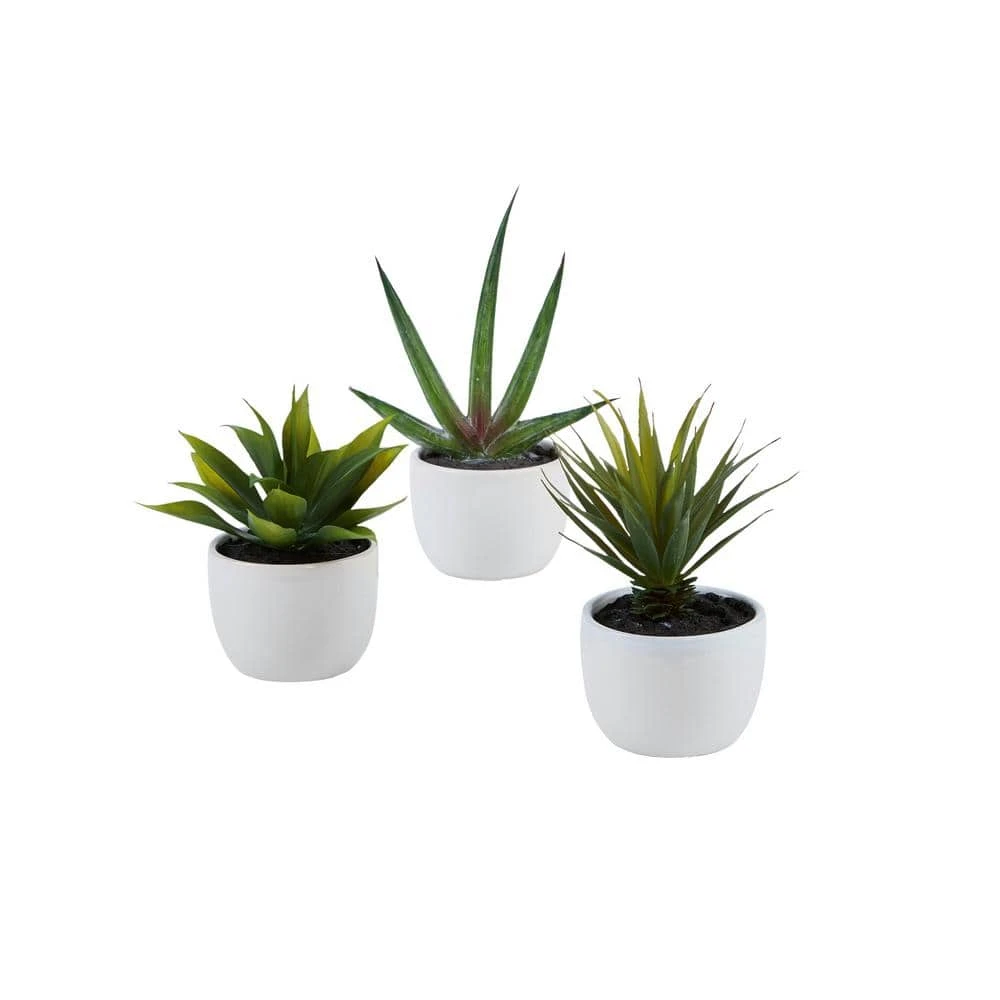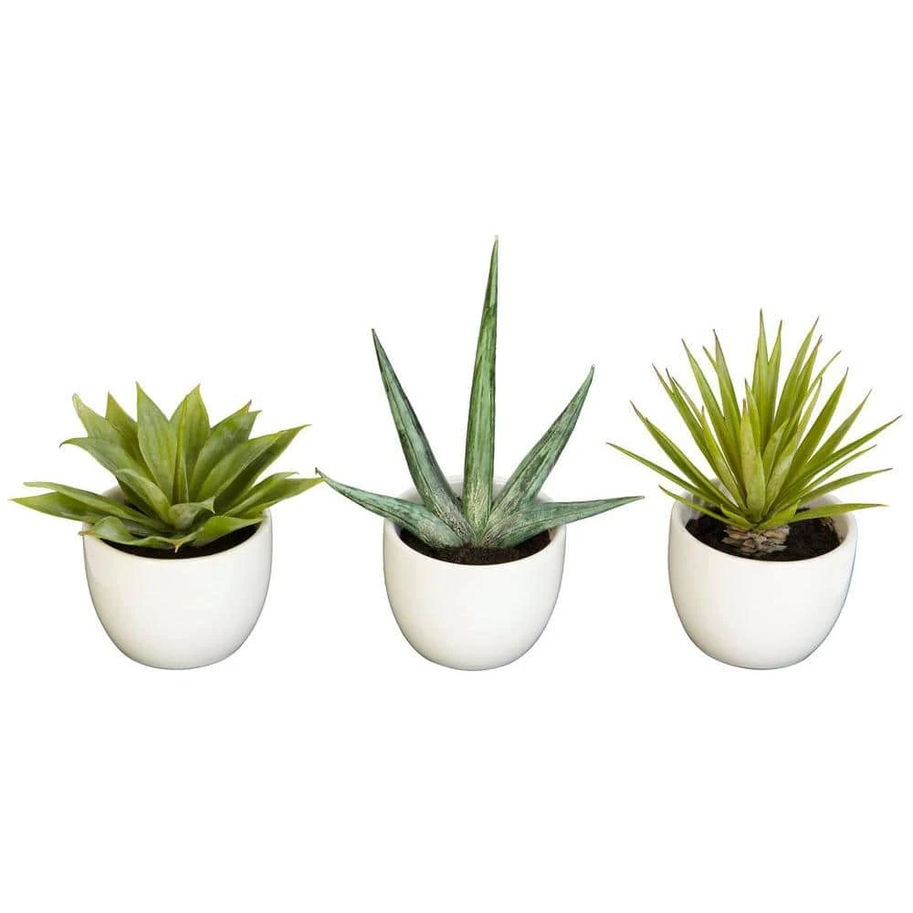 Enjoy the simple beauty of the incredible Agave plant with our 3-piece Southwest Agave Collection. Each piece is a sample of the different varieties of Agave. Enjoy a 5.5 in. high thick green leaved Agave, the sparsely leaved 8.5 in. high version, or the multi leaved 7 in. high spiky piece. Put them together or around the house for a Southwestern or Central American feel.
