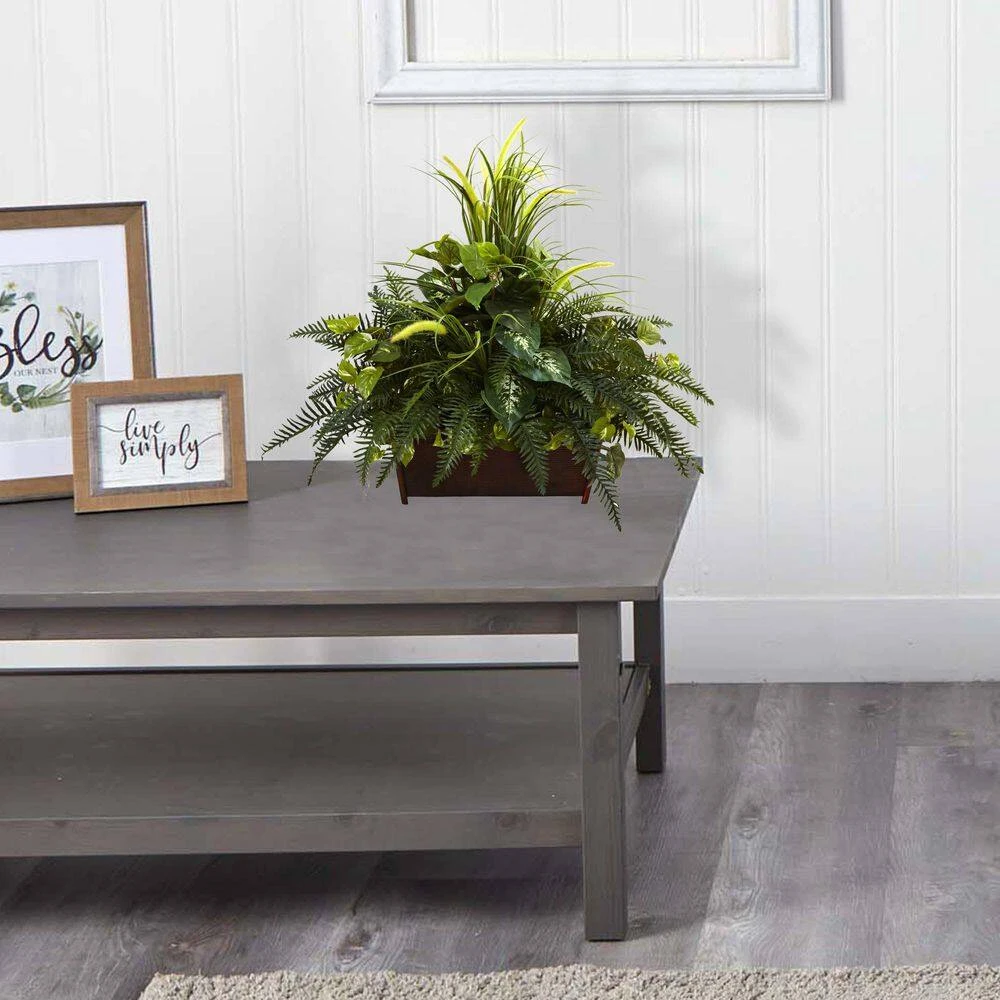 Hey, let’s combine a beautiful river fern with some decorative grass and see how it looks… well, as soon as we did that, we sat back and marveled how well it comes together. The beautiful river fern makes for a soft, delicate base for the wispy decorative grass that rises out of the center. This beautiful pairing is then housed in an attractive, stately window box style planter, perfect for both home and office.