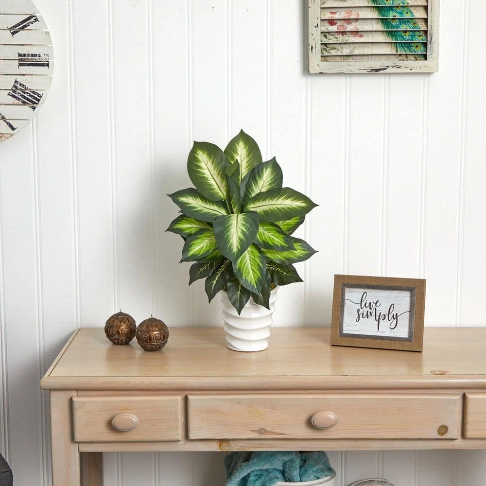 The dieffenbachia plant has thick, lifelike variegated green and white leaves growing out of lifelike stems. The arrangement includes a playful white swirl planter generously topped with faux moss. Try this dieffenbachia in the kitchen or bath, but it can add a pop of color anywhere, inside or out, thanks to quality craftsmanship and the finest materials.