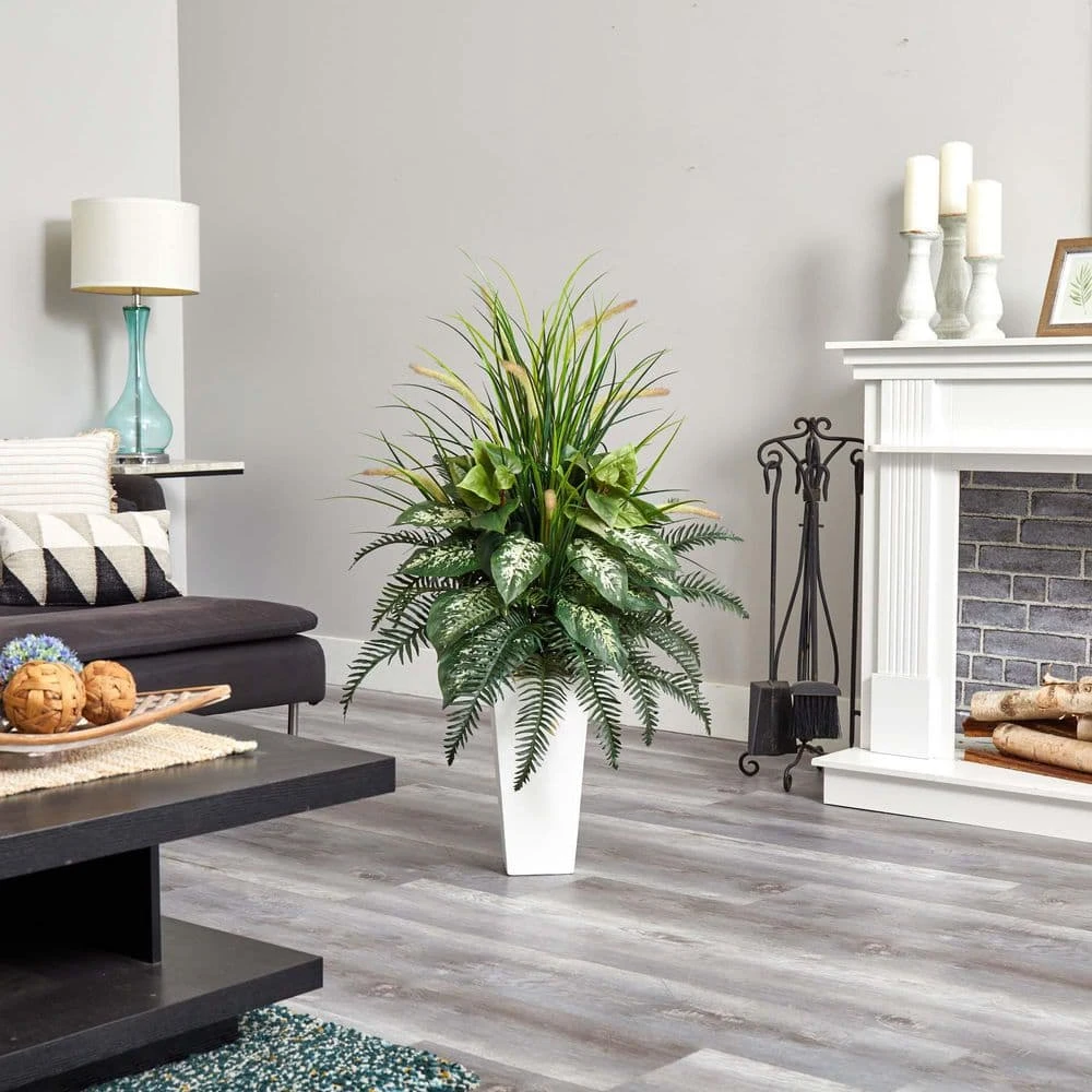 The mixed greens artificial plant boasting river fern with dogtail bush is exotic in its beauty. A combination of lush leaves, mixed with various green hues make this piece stand out from the rest. It comes in a white tower planter.
